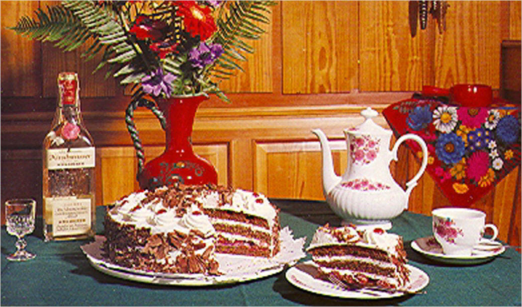 SCHWARZWÄLDER KIRSCHTORTE - 100 gr. Butter, 100 gr. Zucker, 1 Päckchen Vanillezucker, 4 Eier, 75 g Mandeln, 100 g Schokolade, 50 g Mehl, 50 g Stärkemehl, 2 gestr. Teelöffel Backpulver. Und die Füllung mit: 6-7 Esslöffel Kirschwasser, 500 gr. Kirschen, 1/2 Liter Sahne. ZUBEREITUNG: Butter schaumig rühren und löffelweise Zucke rund Vanille zugeben. Danach die ganzen Eier unterrühren. Die Mandeln und gerieben Schokolade hinzugeben. Mehl, Stärkemehl und Backpulver mischen, darübersieben und unter die Schaummasse rühren. Den Teig in eine Springfrom geben und backen. Die Torte nach dem erkalten dreimal durchschneiden. Die untere Tortenplatte mit Kirschwasser beträufeln und mit den Krischen bestreichen bzw. belegen. Die zweite Torenplatte drauf und auch diese beträufeln und belegen. Zum Schluss die dritte Platte darübe rund beträufeln. Die Oberfläche und den Rand der Torte mit Schlagsahne bestreichen und mit Schokolade, Sahne und Kirschen verzieren.